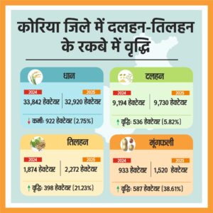 मुख्यमंत्री श्री विष्णुदेव साय द्वारा प्रदेश के किसानों और ग्रामीणों को आर्थिक रूप से सशक्त बनाने के लिए उठाए गए ठोस कदमों का ही यह परिणाम है कि अब जिले के किसान फसल विविधीकरण की ओर अग्रसर हो रहे हैं। जिले के किसान धान के अलावा दलहन, तिलहन फसलों के माध्यम से अपनी आमदनी बढ़ाने में रूचि ले रहे हैं। आने वाले समय में कोरिया जिला दलहन-तिलहन उत्पादन के क्षेत्र में अग्रणी जिलों में शामिल होगा।कृषि विभाग द्वारा किसानों को उन्नत बीज, तकनीकी मार्गदर्शन और विपणन सुविधाएं उपलब्ध कराई जा रही हैं। विभागीय अधिकारियों के अनुसार, जलवायु और मिट्टी की उपयुक्तता के चलते जिले में तिलहन और दलहन दोनों की पैदावार में और वृद्धि की संभावना है।