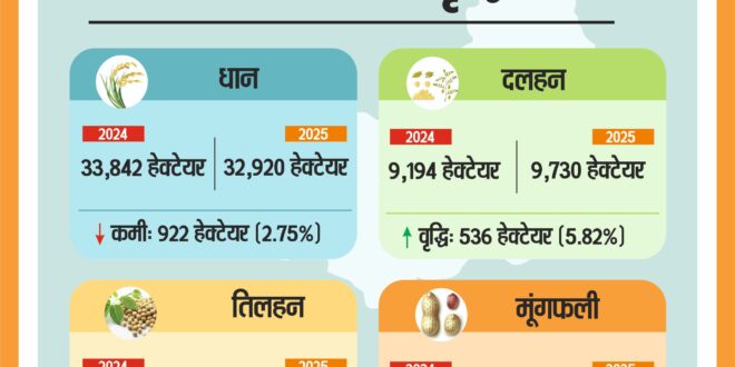 जिले में दलहन और तिलहन फसलों के रकबे में उल्लेखनीय वृद्धि हुई है। विगत वर्ष 9,194 हेक्टेयर में दलहन की खेती की गई थी, जबकि इस वर्ष यह बढ़कर 9,730 हेक्टेयर हो गई है यानि 536 हेक्टेयर (5.82 प्रतिशत) की वृद्धि की गई है। वर्ष 2024 में 1,874 हेक्टेयर क्षेत्र में तिलहन की बुवाई हुई थी, जबकि वर्तमान वर्ष में यह बढ़कर 2,272 हेक्टेयर तक पहुँच गई है यानी 398 हेक्टेयर (21.23 प्रतिशत) की बढ़ोतरी हुई है।